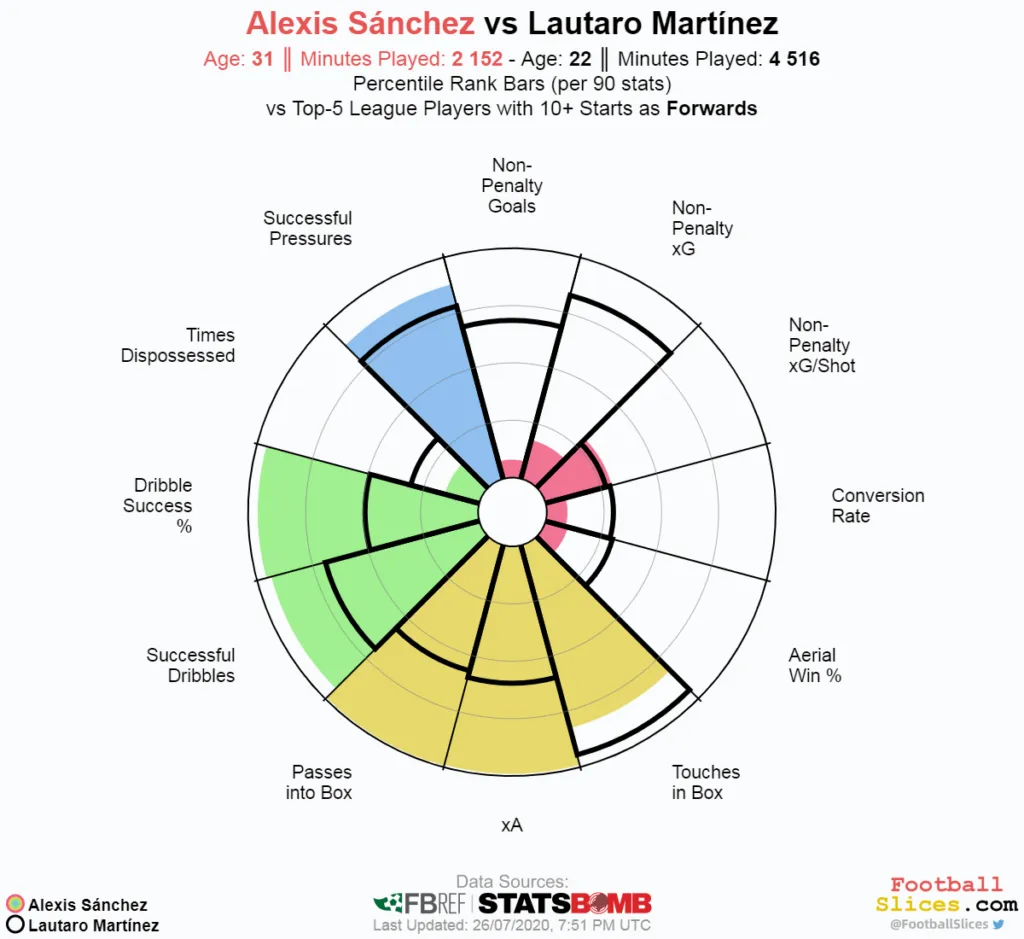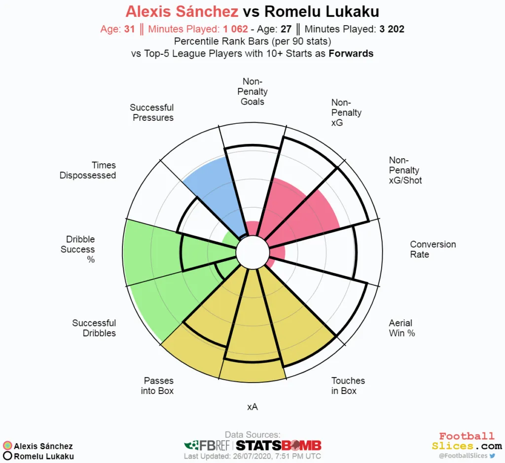 Hogy még pontosabb képet kapjunk arról, milyen stratégiai lehetőségeket ad Conte kezébe Alexis jelenléte a Lukaku–Martínez csatársor mellett, érdemes összehasonlítani a három játékost a kitűnő FootballSlices poszt-specifikus radarjai alapján. Lukakuval összehasonlítva őt jól látszik, hogy a belga sokkal inkább a kapu előtt jól használható, fizikailag is erős csatár: az idei szezonban az Interben a lövések minőségére vonatkozó mutatókban (nPG, nPxG, npxG/lövés, valamint a lövések és gólok hányadosával kiszámolt konverziós ráta) egyértelműen Lukaku a jobb, valamint fizikai adottságainak köszönhetően Alexisnél jóval több fejpárbajt is nyert. A tizenhatoson belül eltérő profiljuk ellenére közel ugyanannyiszor értek labdába, ám a passzolásra és cselezésre vonatkozó mutatókban Alexis messze jobb teljesítményt nyújt. Igaz, több labdát vesztett Lukakunál, ez magyarázható azzal, hogy gyakran lép vissza a középpályára és kap háttal labdát az ellenfél által legjobban felügyelt területen. Védekezésben pedig Alexis nagyságrendekkel több sikeres nyomásgyakorlást tudott felmutatni, így a különböző presszingsémákban is jól használható lehet.