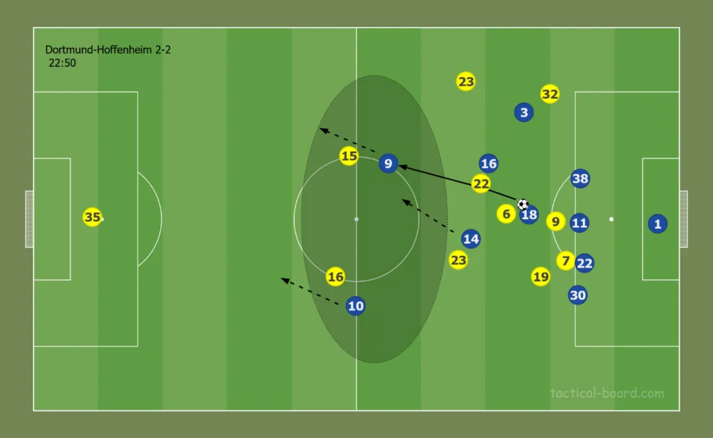 Az idei szezonban a Borussia Dortmund többször is megszenvedett már a labdavesztéseket követő gyors kontrákkal, a Hoffenheim elleni mérkőzésen is többször került így bajba. Itt is egy dortmundi labdavesztés után indult a kontra. Látható, hogy a két védőnek Mats Hummelsnek (15) és Manuel Akanjinak (16) milyen nagy területet kell levédenie, ráadásul létszámegyenlőségben vannak a Hoffenheim két támadójával. Diadie Samassékou (18) megjásza Ihlas Bebout (9), aki lekészíti a labdát a mélységből az üres területbe befutó Christoph Baumgartnernek (14). Az osztrák zavartalanul indíthatta az időközben beinduló támadót, aki Hummelset lendületből átfűzve egy az egyben mehetett Marwin Hitz (35) kapujára.