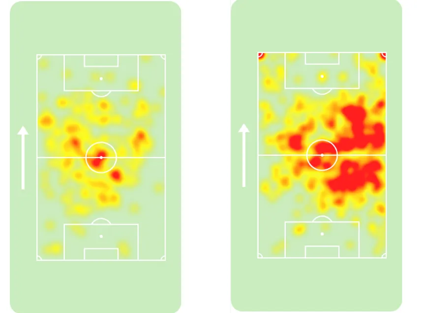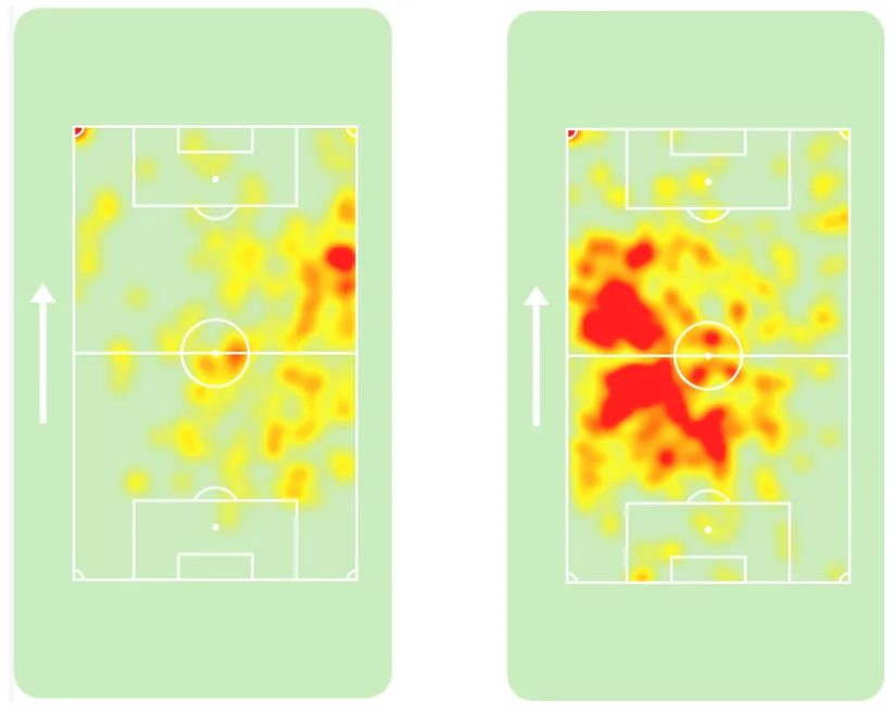 Modric 2012-es és 2018-as hőtérképei (Forrás: sofascore.com)