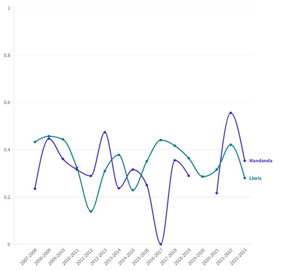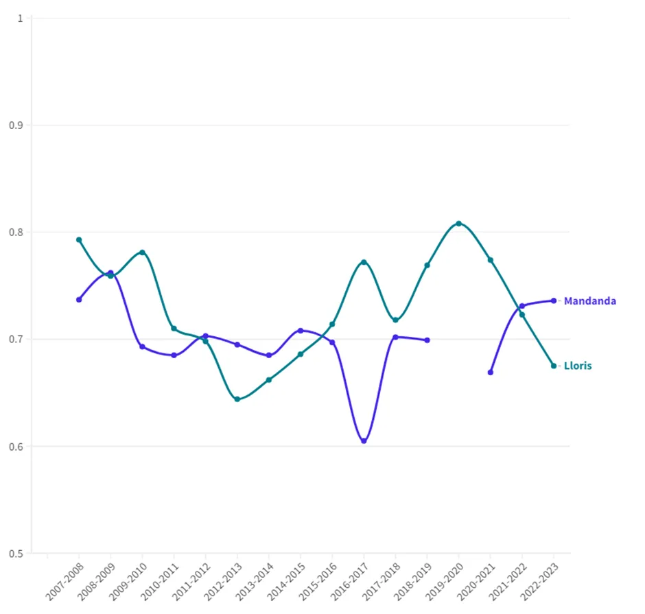 Mandanda és Lloris védési hatékonysága szezonról szezonra